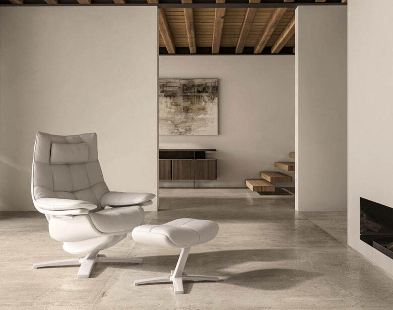 Outro destaque é a base giratória de perfil baixo, projetada para facilitar o ato de sentar-se ou levantar-se da poltrona, ao mesmo tempo em que contribui para a leveza visual da peça. Os apoios de braço, por sua vez, acompanham o movimento da poltrona da posição vertical até a reclinada, mantendo o suporte contínuo para os braços, seja durante a leitura, o descanso ou o simples ato de contemplar o ambiente.